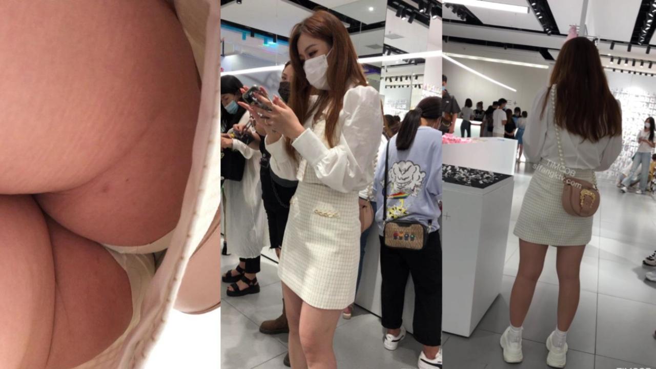 抄底超短白色牛仔裙小姐姐逛街,穿白色骚气丁字裤